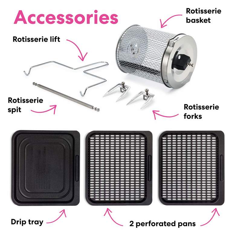 The Instant Pot Vortex Pro 10 Quart Air Fryer is an incredibly versatile kitchen appliance with 9-in-1 functionality, advanced EvenCrisp Technology, 6 customizable programs and fast preheating capabilities. It also comes with various accessories such as a non-stick drip pan and 2 perforated cooking trays, stainless-steel rotisserie basket, rotisserie spit and forks, as well as lift tool. The product is also proven safe with Overheat Protection and auto-off features plus comes with a free app over 1900 recipes for iOS and Android.
