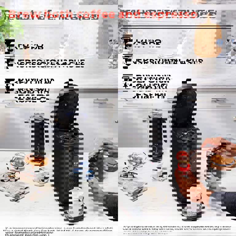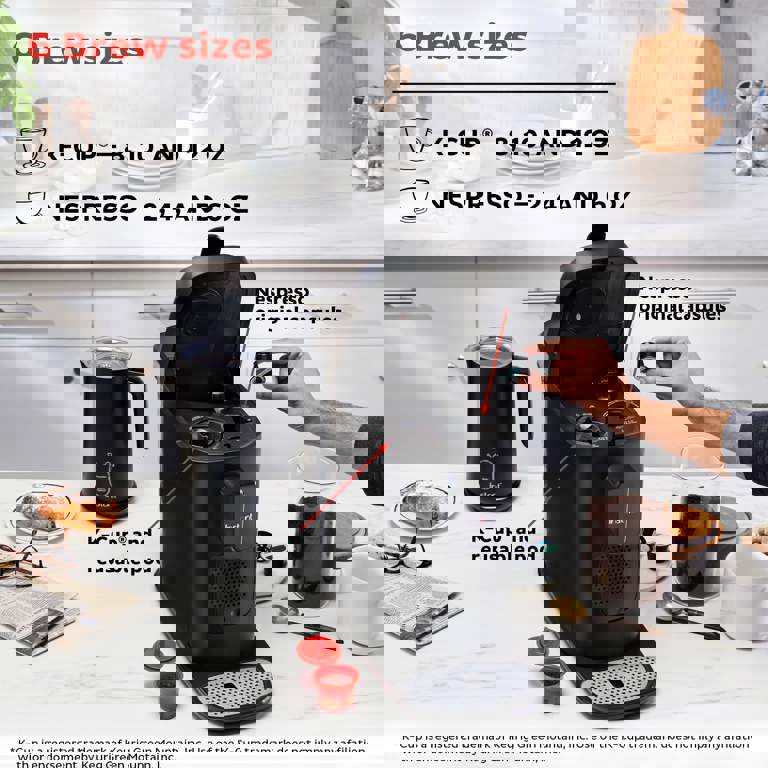 - Compatible with any K-Cup, Nespresso ‘Original Line’ Pods & Coffee Grounds (used with the reusable capsule)